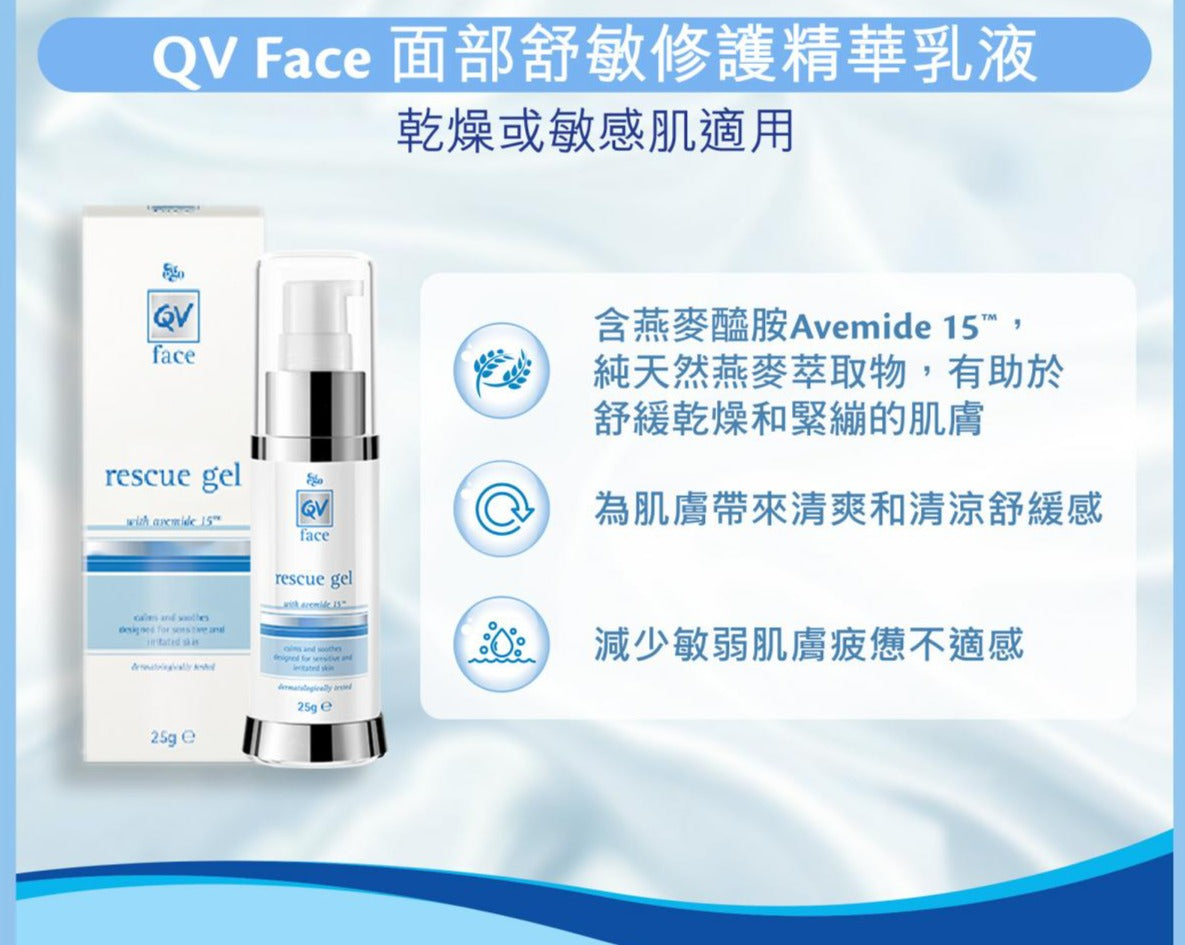 QV Face 舒敏修護精華乳液,質地輕盈的保濕精華液,糅合多重保濕因子及抗氧化成分: 維他命B3、維他命原B5、維他命E及燕麥醯胺Avemide 15™,有助強化肌膚屏障,增加肌膚水潤度和彈性,為肌膚帶來明顯緊緻和飽滿感覺1