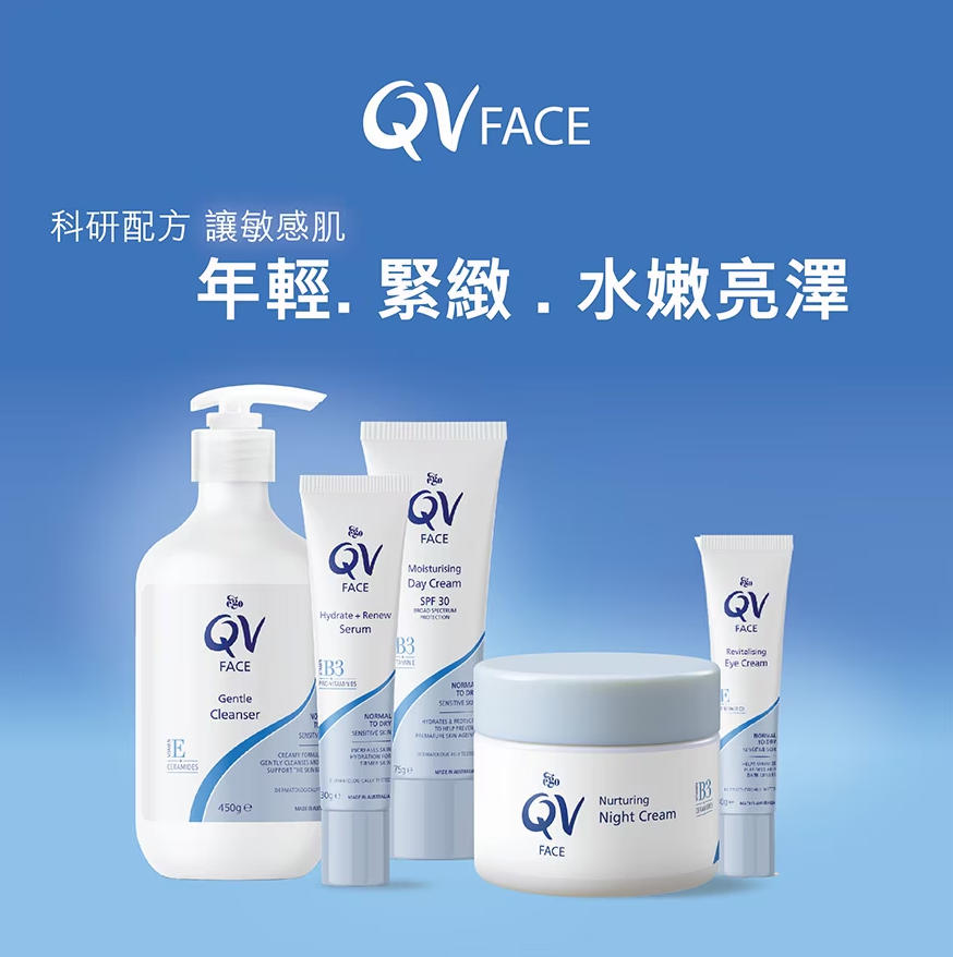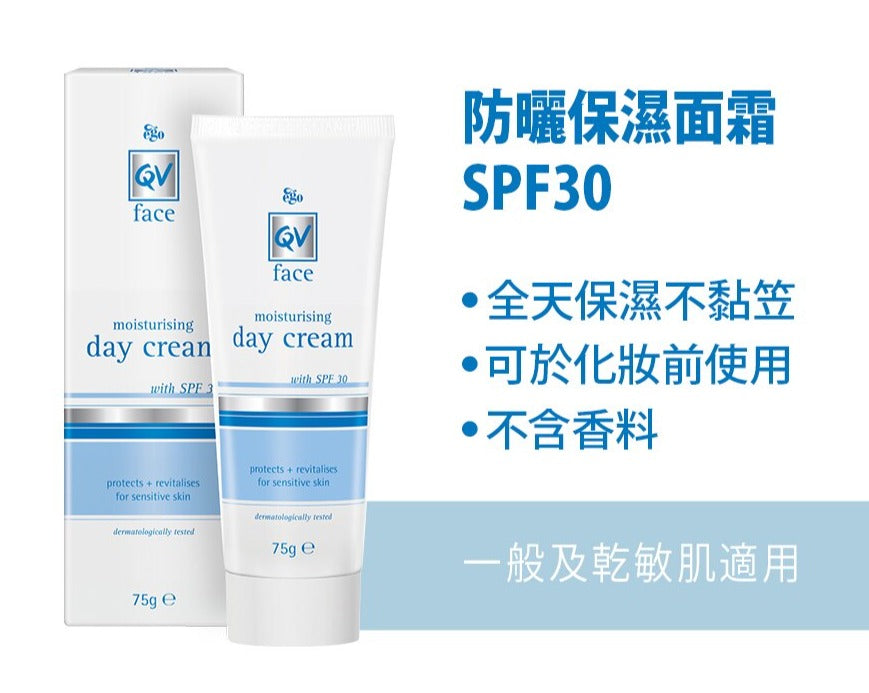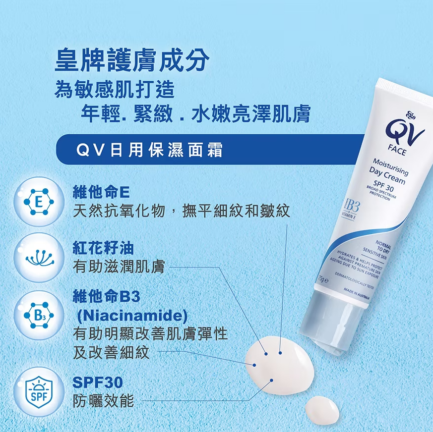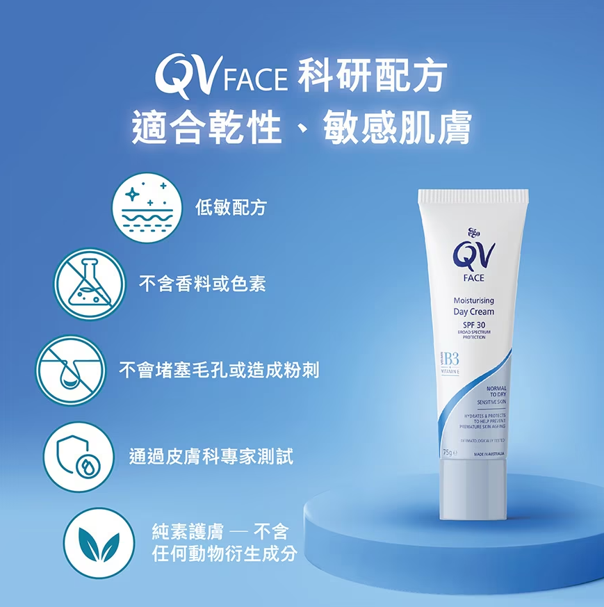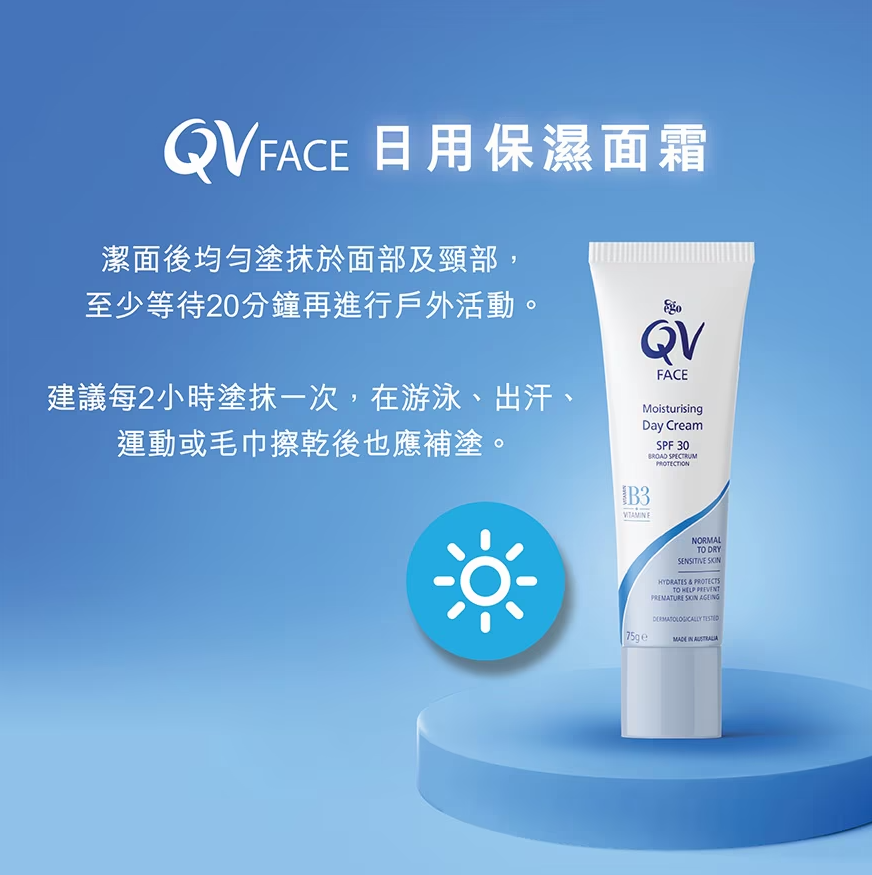 QV Face日用保濕面霜採用科研配方,蘊含三重保濕成分(Occlusive, Emollient and Humectant),有助滋潤及舒緩敏感肌膚。結合SPF 30防曬功能,有助抵禦UVA和UVB。