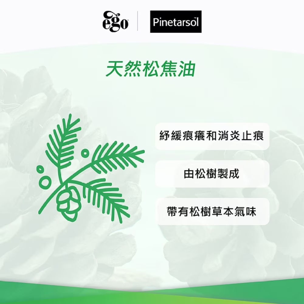 - 含有松焦油,可緩解嚴重濕疹、肌膚炎症、其他乾燥、痕癢,發炎或片狀皮膚的狀況